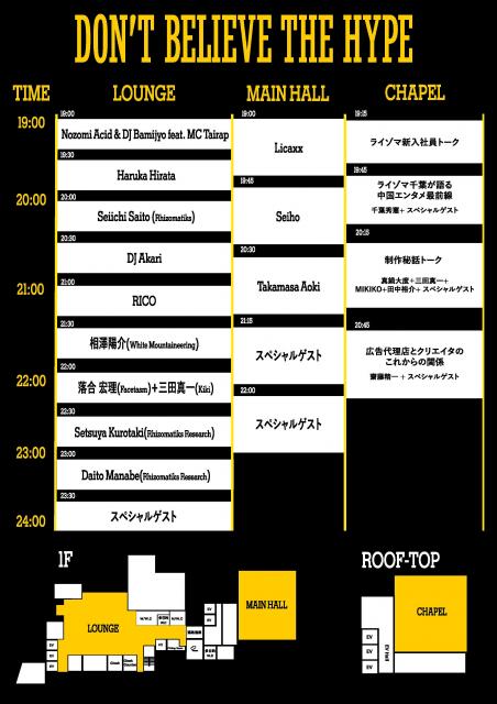 DJs/TALK: DJ Akari, AOKI takamasa, DAITO MANABE(Rhizomatiks Research), Haruka Hirata, Hiromichi Ochiai (FACETASM), Kunihiko Morinaga(ANREALAGE), Licaxxx, MIKIKO, OL Killer, RICO HILOTA, Seiho, SETSUYA KUROTAKI(Rhizomatiks Research), Shinichi Miter, Yosuke Aizawa(White Mountaineering), Yusuke Tanaka(Caviar), and more special guest !
