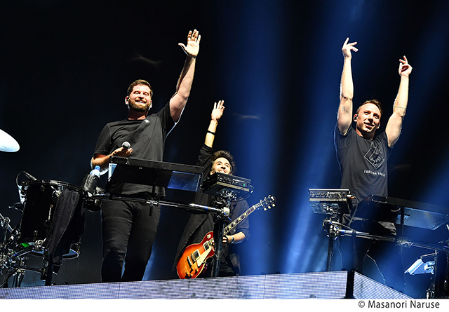 こうして最新作『A Moment Apart』の感動的なオープニングが再現されたあと、登場したのは6人編成のドラム隊。スネア・ビートが力強く打ち鳴らされると、まさかの展開に圧倒されたのか、ざわめき混じりの歓声が沸き起こる。ここまで5分足らずのパフォーマンスで会場を一気に掌握すると、そこからは彼らの独壇場だった。